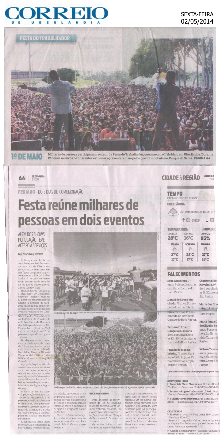 Reportagem do Jornal Correio de Uberlândia do dia 2 de Maio (sexta-feira) de 2014, demonstra o sucesso deste tradicional evento organizado pelo Reinaldão do Sinticom-tap com estrutura da Band Triângulo, e parcerias como Feticom-MG, Contricom, Força Sindical, MRV, Mota Serviços, Crystal, Pasi Assistência Social, Prefeitura Municipal e muitos outros